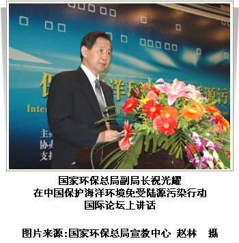 祝光耀指出,中国在保护海洋环境免受陆源污染方面进行了积极探索,做了大量工作:坚持陆海兼顾和河海统筹的原则,先后制定了《渤海碧海行动计划》、《辽河水污染防治计划》、《海河水污染防治计划》、《淮河水污染防治计划》等,将河流污染防治和海域污染防治结合起来;制定了《中国生物多样性保护行动计划》和《全国生态环境保护纲要》,加强陆地生态系统保护,加强海岸带及海洋生态系统保护;积极推进经济增长方式转变,大力发展循环经济、推行清洁生产,加强工业污染防治。在城市污水处理方面,推动城市污水处理厂建设,提高城市污水处理率。同时,不断完善环保法律、法规、制度建设,严格环保依法行政。作为国际社会一员,中国在致力于保护本国沿海和海洋环境的同时,积极参与海洋环境保护的国际合作,认真履行所承担的国际义务,努力推进国际海洋环境保护事业发展。