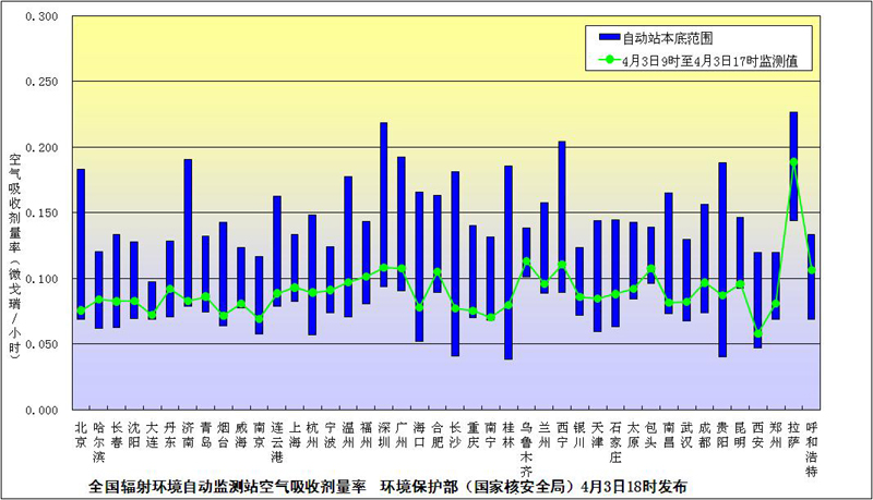 下图是环境保护部(国家核安全局)4月3日18:00继续发布的全国省会城市和部分地级市辐射环境自动监测站实时连续空气吸收剂量率监测值。监测结果汇总图中绿色曲线代表监测值,蓝色柱体代表天然本底水平,绿色曲线均在蓝色柱体范围内。监测结果表明,目前我国环境辐射水平仍在本底范围内,日本核电事故未对我国环境及境内公众健康产生影响。