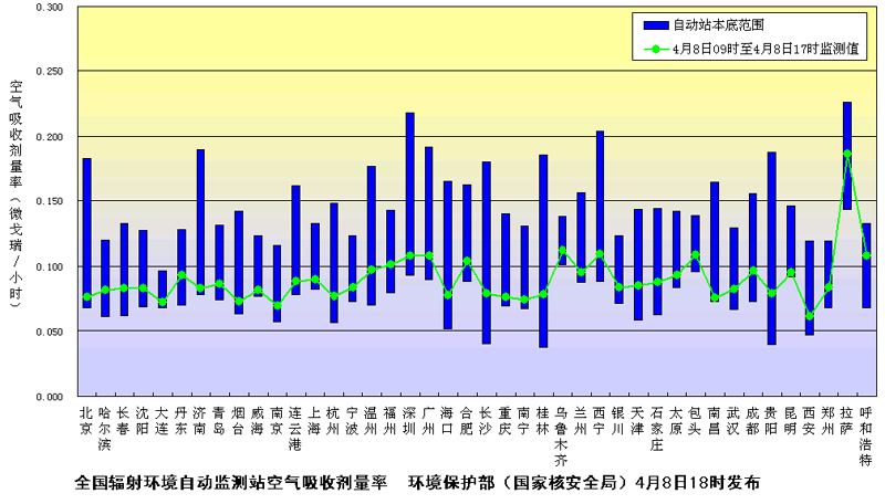 下图是环境保护部(国家核安全局)4月8日18:00继续发布的全国省会城市和部分地级市辐射环境自动监测站实时连续空气吸收剂量率监测值。监测结果汇总图中绿色曲线代表监测值,蓝色柱体代表天然本底水平,绿色曲线均在蓝色柱体范围内。监测结果表明,目前我国环境辐射水平仍在本底范围内,日本核电事故未对我国环境及境内公众健康产生影响。