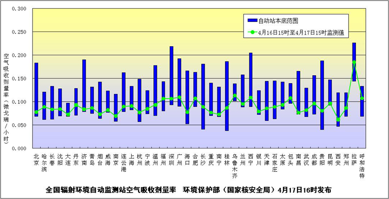 下图是环境保护部(国家核安全局)4月17日16:00继续发布的全国省会城市和部分地级市辐射环境自动监测站实时连续空气吸收剂量率监测值。监测结果汇总图中绿色曲线代表监测值,蓝色柱体代表天然本底水平,绿色曲线均在蓝色柱体范围内。监测结果表明,目前我国环境辐射水平仍在本底范围内,日本核电事故未对我国环境及境内公众健康产生影响。
