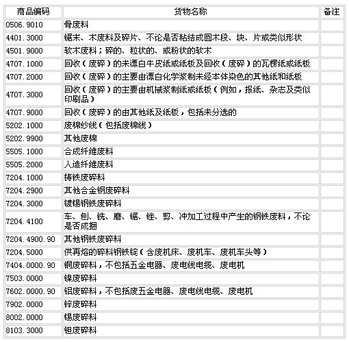 对未纳入对外经济贸易部、国家环境保护总局、海关总署、国家质量监督检验检疫总局2001年第41号公告《限制进口类可用作原料的废物目录》(第一批)内的铜废碎料、铝废碎料、钢铁废碎料、废纸等可用做原料的废物(见附件),实行进口自动登记管理。海关暂凭国家环境保护总局和检验检疫机构分别签发的《进口废物批准证书》(标注自动进口许可字样和入境货物通关单)验放。