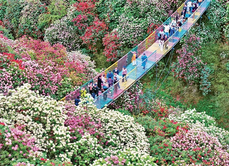 发展绿色生产力,坚持绿水青山就是金山银山理念,推动经济社会发展全面绿色转型,是满足人民日益增长的优美生态环境需要的必然要求。图为2024年4月4日,游客在贵州省毕节市百里杜鹃景区踏青赏花(无人机照片)。 新华社发 李华/摄