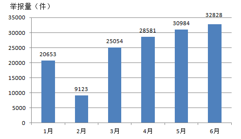 2018年6月,平台共录入电话举报32828件,相比上月增加1844件,环比增长6%;相比去年同期减少3811件,同比降低10.4%。