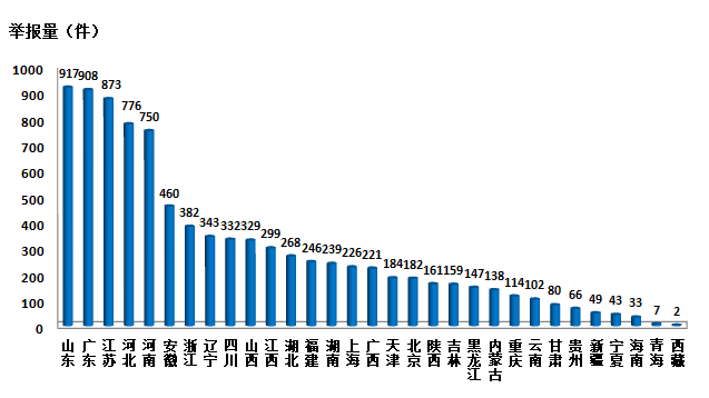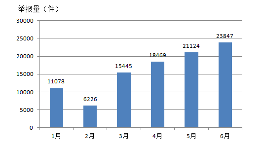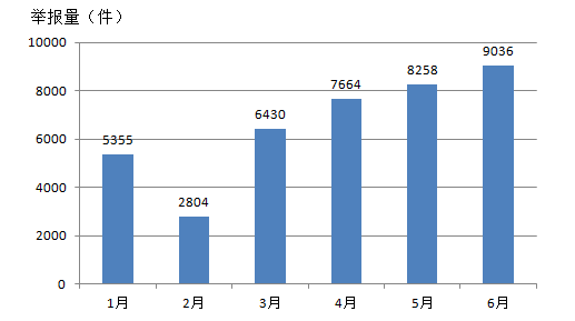 2018年6月,全国共接到网上举报9036件,相比上月增加778件,环比增长9.4%;相比去年同期增加1784件,同比增长24.6%。