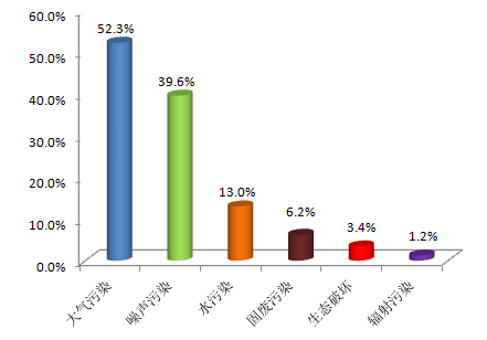 大气污染举报中,反映恶臭/异味污染的举报最多,占涉气举报的41.7%,其次为烟粉尘及油烟污染的举报,分别占涉气举报的29.8%和20.4%。噪声污染举报中,反映建设施工噪声污染的举报最多,占噪声举报的44.9%,其次为反映工业噪声的举报,占28.1%。水污染方面,反映工业废水污染的举报最多,占涉水举报的52.4%。