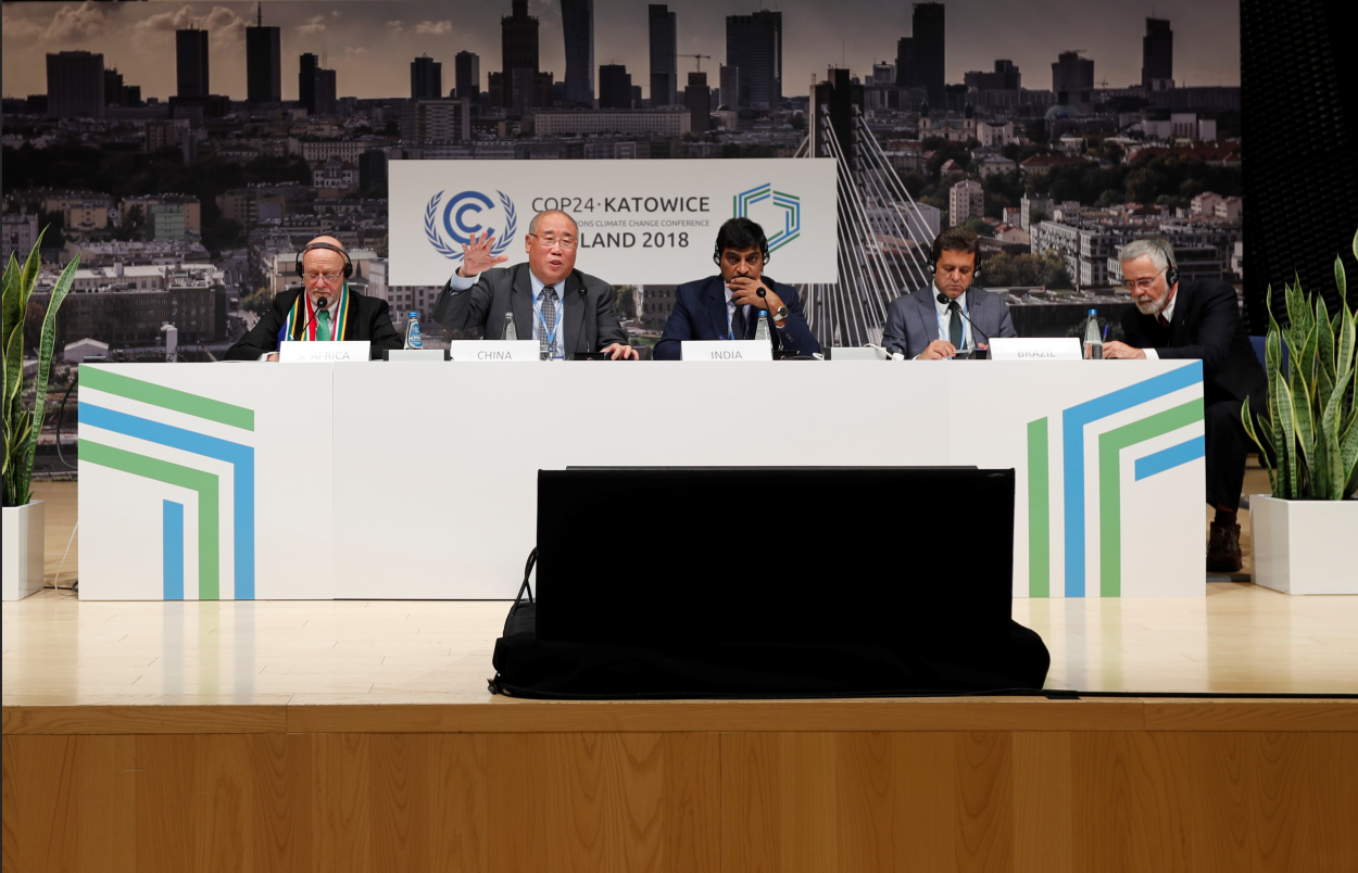 当地时间12月12日,基础四国新闻发布会在联合国气候变化卡托维兹大会新闻发布厅举行,表达四国希望推动卡托维兹大会取得成功、共同维护多边机制有效性的决心和立场。中国应对气候变化事务特别代表解振华、印度环境部副部长阿伦·梅塔(A K Mehta)、南非代表团团长德里克·哈内克姆(Derek Hanekom)、巴西环境部长爱德森·杜阿特(Edson Duarte)共同出席发布会并回答了记者提问。