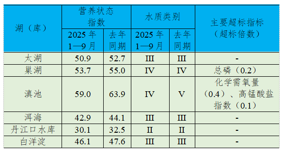 1—9月,监测的209个重点湖(库)中,水质优良(Ⅰ—Ⅲ类)湖库个数占比76.6%,同比下降2.0个百分点;劣Ⅴ类水质湖库个数占比3.8%,同比下降0.5个百分点。主要超标指标为总磷、化学需氧量和高锰酸盐指数。203个监测营养状态的湖(库)中,中度富营养的3个,占1.5%;轻度富营养的54个,占26.6%;其余湖(库)为中营养或贫营养状态。其中,太湖水质良好、轻度富营养;巢湖为轻度污染、轻度富营养,主要超标指标为总磷;滇池为轻度污染、轻度富营养,主要超标指标为化学需氧量和高锰酸盐指数;洱海和白洋淀水质均为良好、中营养;丹江口水库水质为优、中营养。