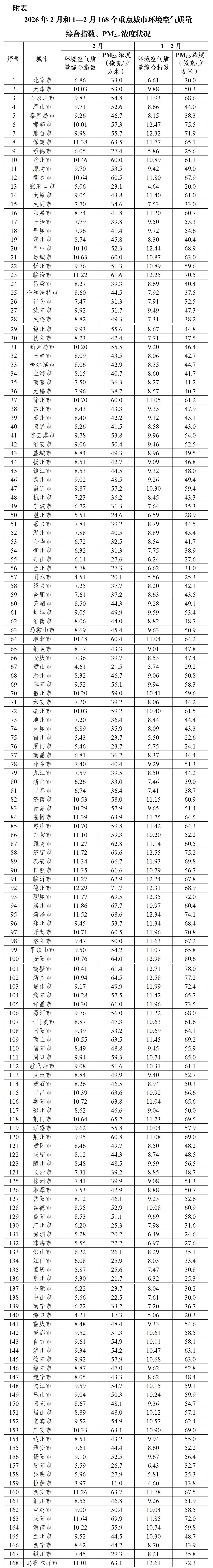 2月和1—2月168个重点城市环境空气质量综合指数、PM2.5浓度状况详见附表。
