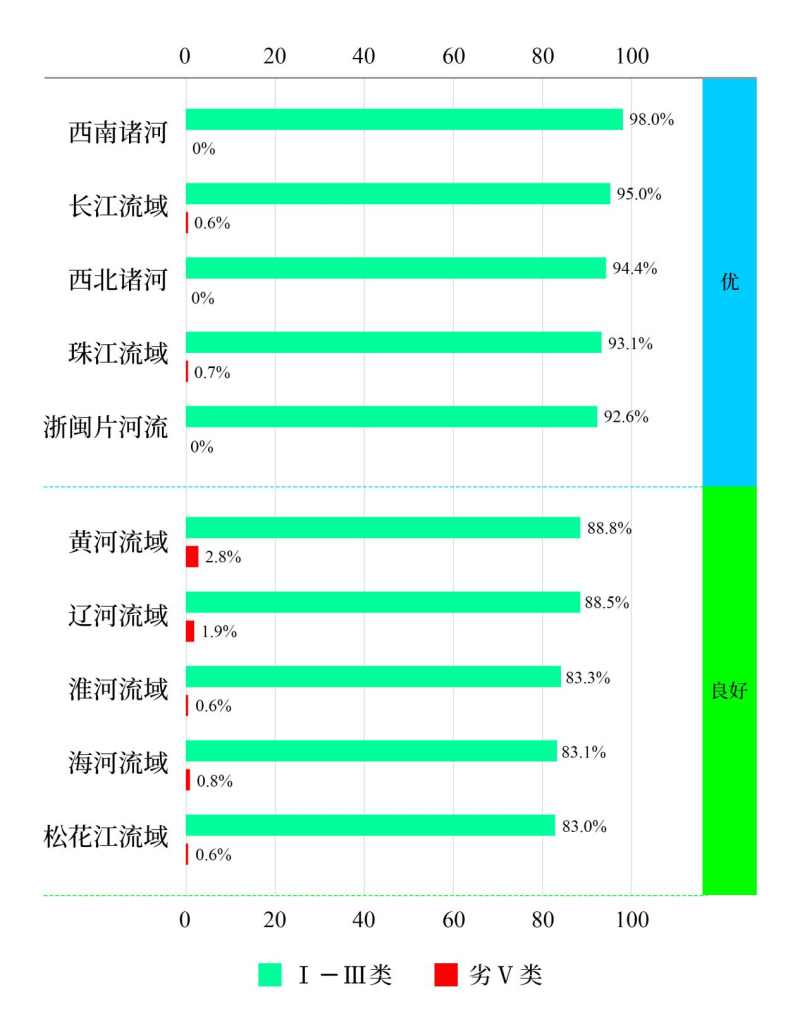第一季度,长江、黄河、珠江、松花江、淮河、海河、辽河等七大流域及西北诸河、西南诸河和浙闽片河流Ⅰ—Ⅲ类水质比例为90.3%;劣Ⅴ类水质比例为0.9%。主要超标指标为化学需氧量、高锰酸盐指数和氨氮。其中,西南诸河、长江流域、西北诸河、珠江流域和浙闽片河流水质为优;黄河流域、辽河流域、淮河流域、海河流域和松花江流域水质良好。