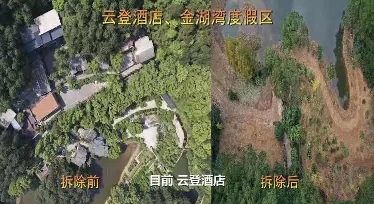 以黛湖周边为例,从上世纪90年代起,云登酒店、金湖湾度假村、大罕宫酒店等环湖而建,这些酒店都存在着少批多建、违规扩建等问题。其中云登酒店建筑面积约1万平方米,有近6900平方米都是违建。重庆市北碚区委办公室副主任吕玉春表示,这些酒店将黛湖团团围住,从黛湖取水、向黛湖排污,不仅影响了水质,还使水位下降了50厘米左右。