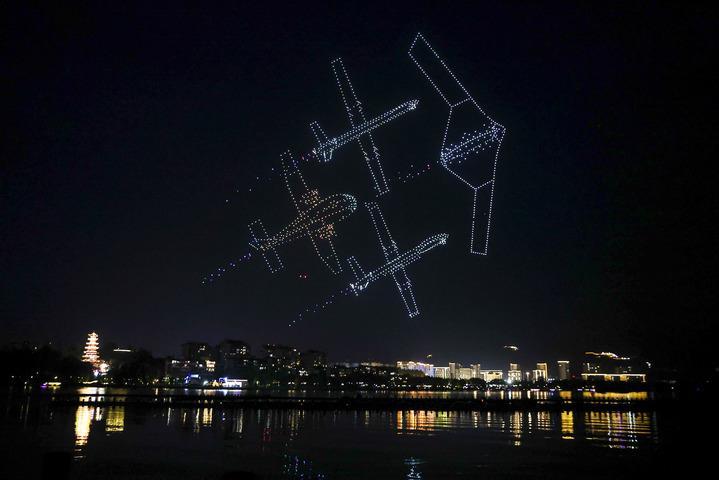 这是7月11日晚在重庆市梁平区双桂湖国家湿地公园拍摄的无人机表演。新华社记者 黄伟 摄